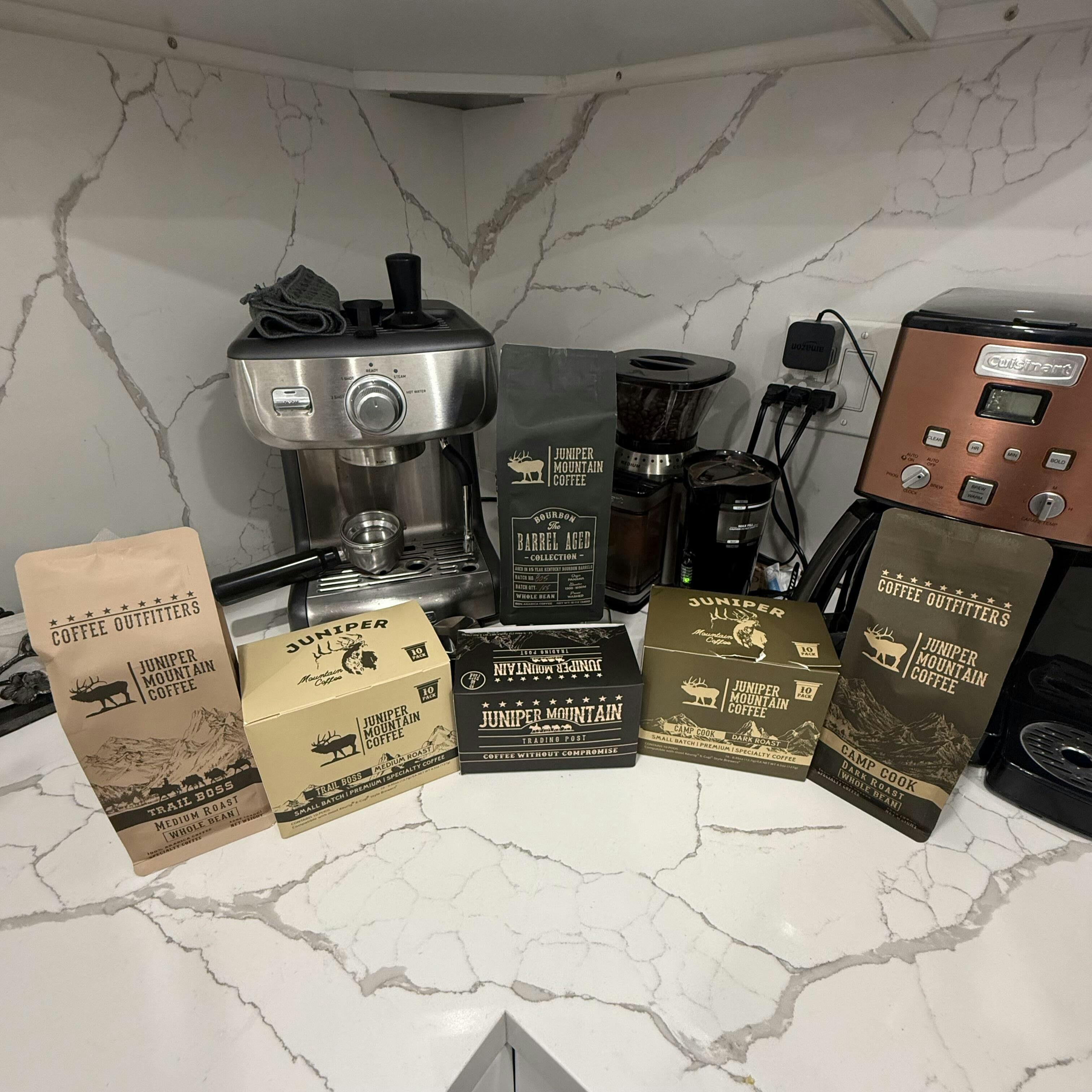 This three-pack bundle includes (1) Bourbon Barrel Aged, (1) Camp Cook (dark roast) and (1) Trail Boss (medium roast) all wrapped up as one package to save you money.